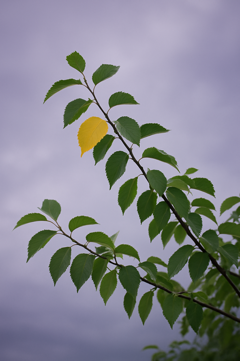Gelbe Blätter zwischen grünem Laub – Zeichen des Wandels.